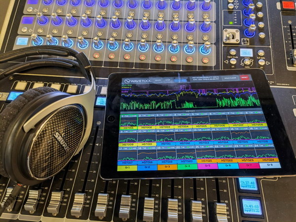 在1層話筒發(fā)放處的工作人員,在為演員佩戴話筒后,可通過Wavetool便攜版本軟件在平板電腦上快速查看 & 監(jiān)聽演員頭戴話筒音頻信號(hào),做到有問題當(dāng)時(shí)發(fā)現(xiàn),現(xiàn)場即刻解決。
