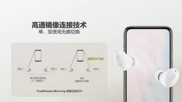 采用高通 TrueWireless Mirroring 鏡像連接技術,耳機與手機的連接信號同步傳輸且更穩定流暢,可任意切換單、雙模式,音樂、通話不中斷。