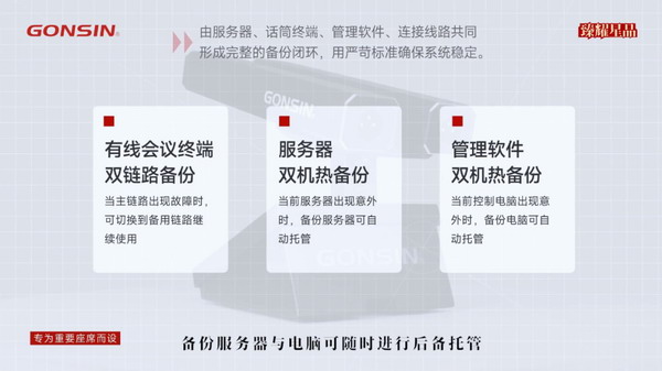 討論系統采用GONSIN公信會議2044和2045兩款雙鏈路備份會議終端,單/雙咪終端組合,為嚴謹的政務會議的匯報發言、重大事項表決等核心會務需求提供穩定的會議設備及技術服務。核心座席的雙咪終端的備份鏈路接口有兩個,更大程度地保證了設備的可靠性,同時雙咪拾音能更好地實現高保真音質,呈現渾厚、飽滿、有力的音效。