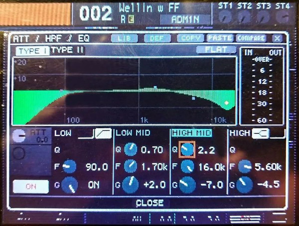 EQ:通過播放參考曲目,我調(diào)整了調(diào)音臺前場補聲的Matrix通道上的參數(shù)EQ。前場補聲的總體思路是減少高頻,因為較小的高頻驅(qū)動器放置在離聽眾更近的位置。