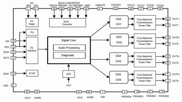為了處理高清音頻,該芯片具有80kHz的帶寬,動態(tài)范圍為117dB,能夠在4Ω負(fù)載下提供四倍43W的功率,其四個智能BTL輸出具有14.4V的飽和輸出。它還具有I2S和I2C數(shù)字輸入,可用于實時監(jiān)測和診斷系統(tǒng),在安全相關(guān)應(yīng)用中使用警告音發(fā)生器。