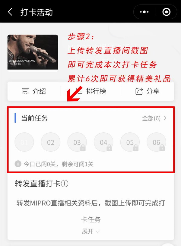 轉發直播預告宣傳頁面,截圖上傳至MIPRO小程序打卡活動中,完成6次活動任務打卡。