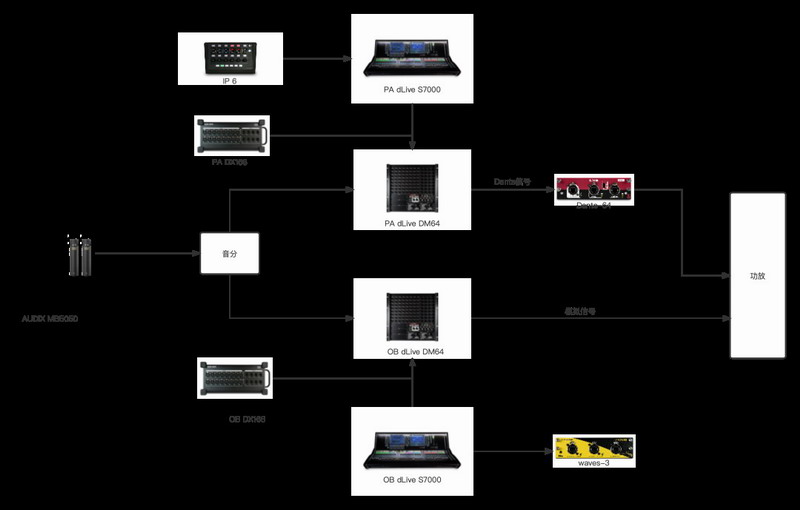OB調音臺至擴聲系統通過傳統的模擬信號進行傳輸,并在OB房間的S7000臺面上加裝了一張Waves卡 用于OB混音。