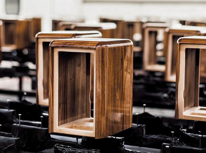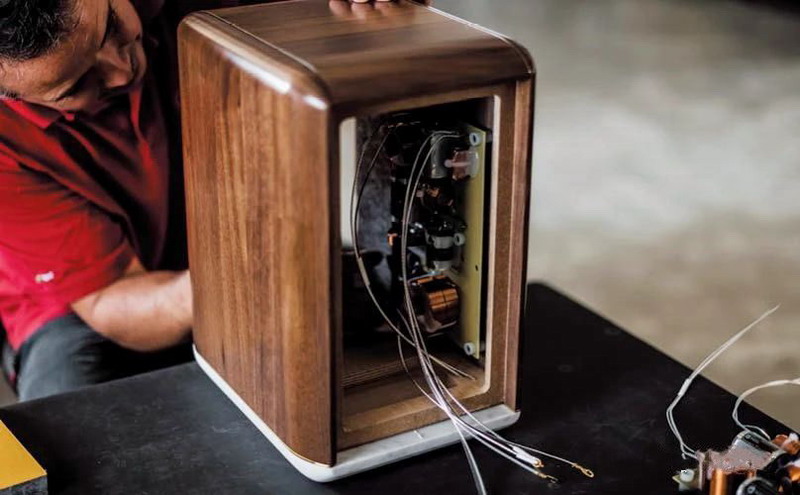 可帶來獨特音色的優質硬木與皮革,依然必不可少!由多件堅固的胡桃木砌出音箱頂板及兩側板,圓渾的接口及邊緣,強化木紋的打磨、鎖色及木油處理等之手工依然精進。前障板及背板上當然少不了緊致地裹上厚厚的優質皮革。而最畫龍點睛者,則要數音箱底板之用料,竟然用云石,更是名貴的意大利Carrara云石,且在木箱身與云石之間夾入黃銅片,于暖調的胡桃木與冷調的云石之間,露出一線帶點華麗的光亮銅邊,令整個音箱來得更精致、「骨子」夾入黃銅片,究竟是純粹裝飾呢,還是制作需要,兩種物料之間需要一個接合介質的界面?或者是控制諧振和校音的功夫?這個問題沒有答案!