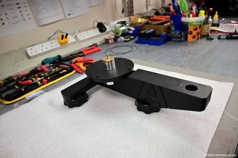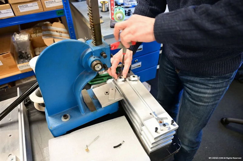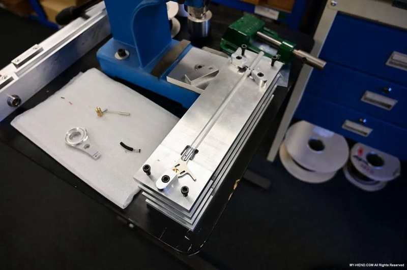 在這里也發現正在開發中的唱臂軌跡,桌上有許多唱臂的組成元件,我手上這個臂管是鈦合金,用于高階的唱臂,另外為了讓唱臂從唱頭蓋與軸心能精準的在同一水平上,AVID設計特殊的機器與模具對唱臂進行高壓機械物理校正。