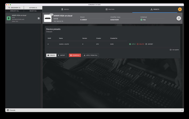 隨著搭載 IEB 和 IEB Pro 內(nèi)核的新版本功率放大器發(fā)布, K-array 陸續(xù)推出了用于聯(lián)網(wǎng)監(jiān)控功放(有源揚聲器系統(tǒng))健康狀態(tài)的應(yīng)用程序 K-monitor,可以使用瀏覽器訪問的“網(wǎng)頁端”功放(有源揚聲器系統(tǒng))應(yīng)用程序,以及移動設(shè)備端用于遙控功放(有源揚聲器系統(tǒng))的移動 APP。