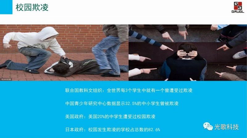 聯合國教科文組織:全世界每3個學生中就有一個曾遭受過欺凌;中國青少年研究中心數據顯示32.5%的中小學生曾被欺凌;美國政府:美國20%的中學生遭受過校園欺凌;日本政府:校園發生欺凌的學校占總數的82.6%。