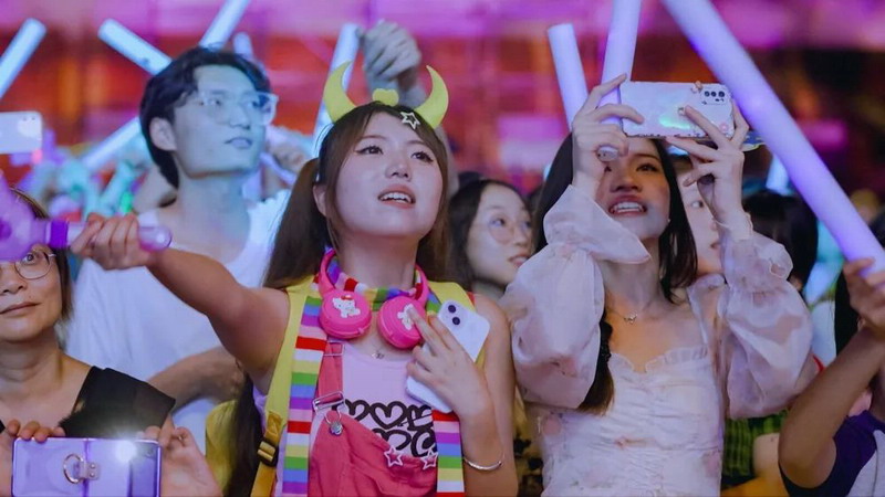 夜晚的音樂節在燈光的照耀下更加絢麗多彩,大家一起揮舞著熒光棒,隨著歌聲擺動,形成一陣陣光的浪潮,與樂隊一起大聲歌唱。