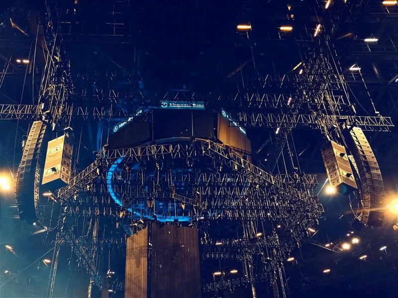 整個舞臺的視覺中心位于梅奔中心場地的一個稍偏心位置,這一位置可以近似視為橢圓形的一個焦點,演出的主視覺屏幕便以立方籠的造型吊掛在空中。17人大編制的樂隊分布在中心舞臺平臺上的不同扇形區塊,隨不同樂章編排實現多面的舞美效果,從而照顧到四面的觀眾。為更好地應對這種演出特性,主擴聲系統便按東、西、南、北四面劃分成為四個子系統,線陣列音箱采用軸對稱吊掛的布置方式,保證整個場地在擴聲上實現聽覺的一致性。這樣一來,通過不刻意強調聲源的位置,整個聲場可以在視覺上盡可能“隱形”,避免對視覺表達和引導產生干擾,這使得觀眾在聚焦視覺的同時獲得寬闊且舒適的聽覺體驗。