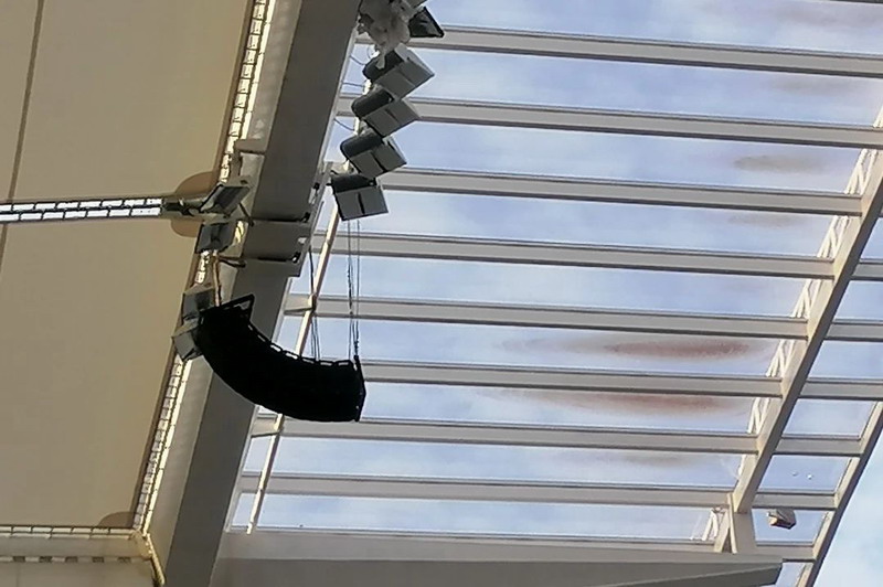 場地區域配置了8組EAW QX364-WP點聲源揚聲器,該型號具備高聲壓級特性,適宜長沖程距離投射,流線型箱體更能減少風阻,寬頻帶指向控制能力可更好地駕馭長混響時間的惡劣環境,一方面能有效控制無序反射聲,提高清晰度;另一方面也能盡可能減少對場外的噪聲干擾,滿足場地頂部半封閉環境的使用需求。