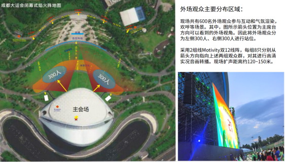 根據(jù)導(dǎo)演團(tuán)隊(duì)要求,閉幕式采用遠(yuǎn)、中、近三景表演空間,為了營(yíng)造全民參與,內(nèi)外場(chǎng)互動(dòng)的演出效果,晚會(huì)特地在主舞臺(tái)后的草坪帳篷營(yíng)地開放了600個(gè)流動(dòng)觀禮席位。屆時(shí),綠油油的草坪、高大的天幕、五彩的帳篷以及一家男女老少的席地而坐、所有在旁邊露營(yíng)的游客都可以作為整臺(tái)演出的一個(gè)背景,都無形中成為演員的一部分。外場(chǎng)觀眾也能夠從大小各異的帳篷里紛紛走出來,通過外場(chǎng)擴(kuò)聲與大屏實(shí)況轉(zhuǎn)播參與到這場(chǎng)狂歡盛會(huì)當(dāng)中。