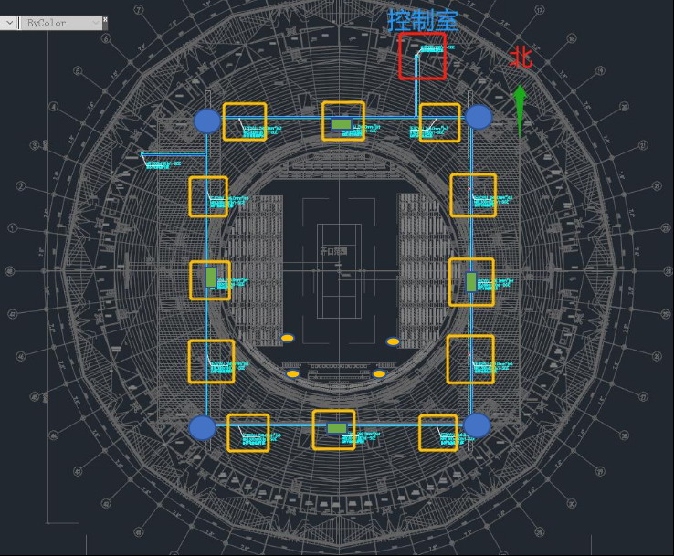 除此以外,在場地馬道的四個角上吊裝4只全頻點聲源揚聲器QX364(藍色標志)來覆蓋中心比賽場地區域,并配置4只超低頻揚聲器SB528(綠色標志),以便在場內舉辦活動時,對音樂信號的低頻能量進行補償。同時,一層主席臺設置4只固定返送(補聲)揚聲器CPL12M(黃色圓圈標志),既為主席臺發言以及場地表演提供清晰、自然的擴聲,又有效縮短揚聲器與發言者之間的距離,從而在一定程度上降低發言與擴聲之間的延時問題。