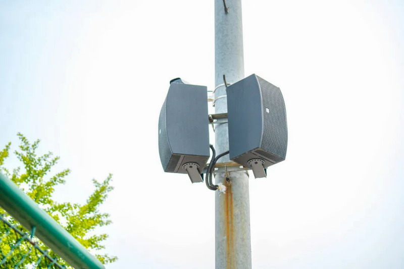 對于外圍球場的8塊場地,共配置了16只ezacoustics FIS-H208iWP全頻點聲源揚聲器進行聲場覆蓋,這是一款雙8寸低音單元+3寸復合強化振膜高音單元的兩分頻揚聲器,緊湊的外觀、132dB的高聲壓級輸出以及全天候防護能力使之非常適用于外圍球場。八組揚聲器每兩只背靠背固定安裝在每兩塊場地之間角部的照明燈柱上,吊裝高度約4米,其號筒在箱體內部做90度旋轉后,形成水平約120°、垂直約60°指向,可以向場地以及兩側觀眾席提供均勻的覆蓋聲場。