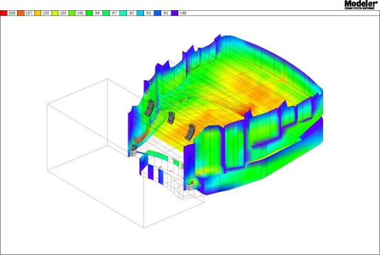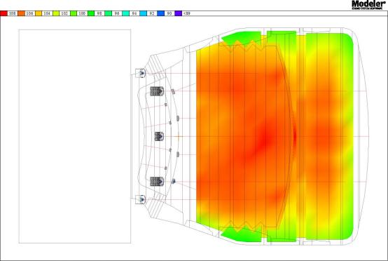 因此,Bose Professional通過Bose的聲場模擬分析軟件Modeler5),對揚聲器的安裝位置及角度進行多次聲場模擬分析,最終采用非對稱水平角度的弧形曲率陣列揚聲器來實現最佳的音色平衡,減少側墻反射(從圖2可以看出,打在側墻的聲能量幾乎沒有),對不同位置的聽音區提供均勻的聲覆蓋(從圖3可以看出,整個觀眾區的聲場覆蓋非常均勻)。