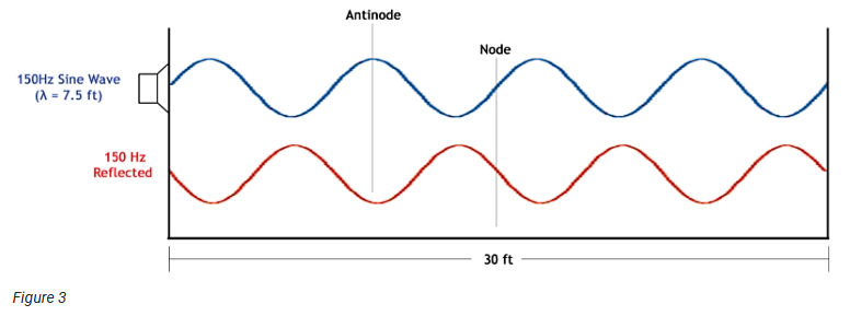如Figure 3所示,在一個平行墻壁之間距離為30英尺的空間中饋入150Hz正弦波信號,平行墻壁之間的距離剛好是150Hz波長的4倍(也就是7.5英尺)。其結果是產生包含被成為波節(振幅最小)和波腹(振幅最大)點位的駐波。