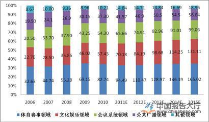 “十二五”期間,隨著國內經濟的進一步發展, “十二五”規劃、《文化產業振興規劃》、《體育產業“十二五”規劃》等鼓勵支持下游產業發展的政策拉動,以及2011年深圳大運會、2013年天津東亞運動會等大型賽事的舉辦,行業發展仍將保持較高的增長速度,年復合增長率可達 13.32%左右。到2015年,行業市場規模將增長至472.79億元! |
